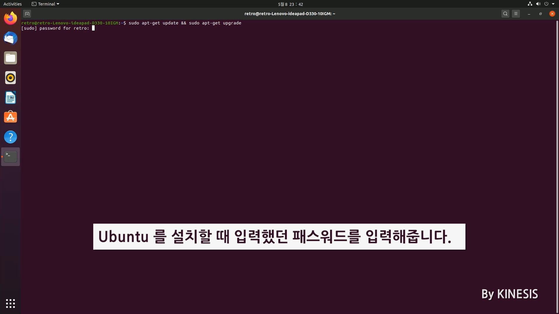 sudo 는 관리자 권한으로 실행하라는 명령어로 초기 실행시 패스워드를 물어볼 수 있습니다. Ubuntu 설치 시 입력했던 패스워드를 입력하고 엔터를 눌러 줍니다.