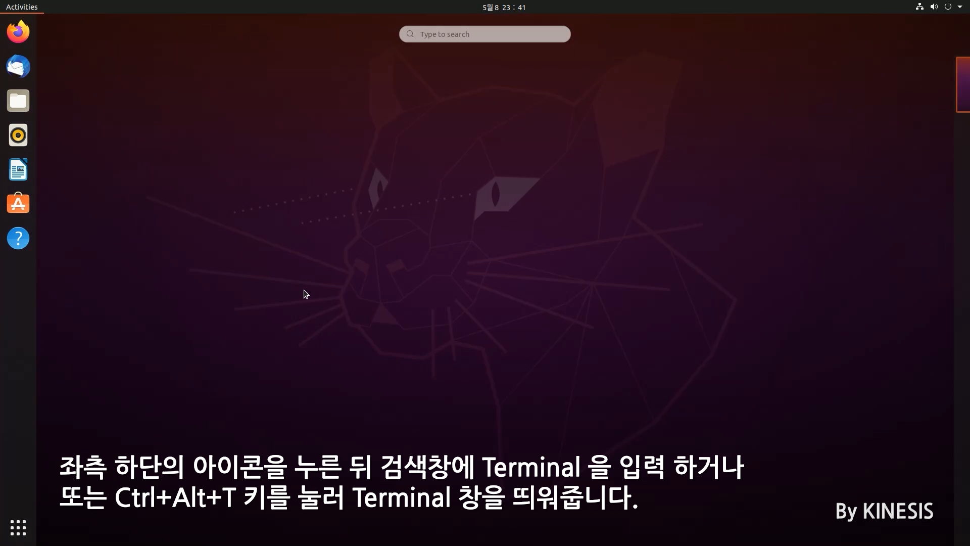 좌측 하단의 9개의 점이 찍혀있는 아이콘을 클릭한 뒤 입력창에 Termianl 을 입력하여 실행해 주시거나 또는 Ctrl + ALT + T 키를 눌러 Terminal 창을 띄워 줍니다.